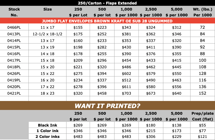 Jumbo Flat Envelopes Brown Kraft Sub 28