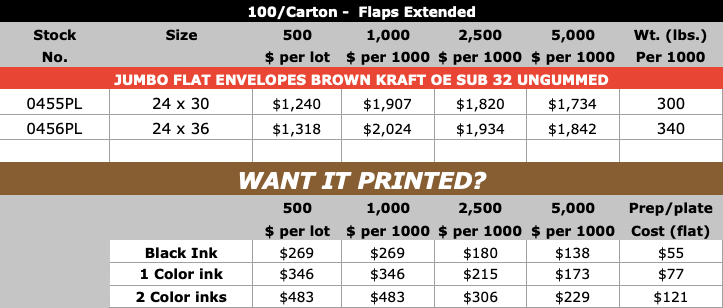 Jumbo Flat Envelopes Brown Kraft 100 per carton