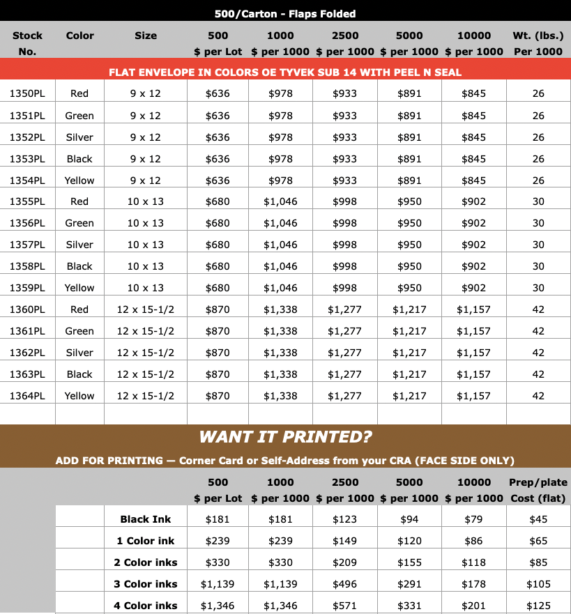Flat, Tyvek® mailers in five bold colors are great no-nonsense envelopes for mailing practically anything that you can fit in a flat envelope, where strength and light weight (to reduce postage costs) are a factor. You can avoid printing your return address by using labels that you already have.