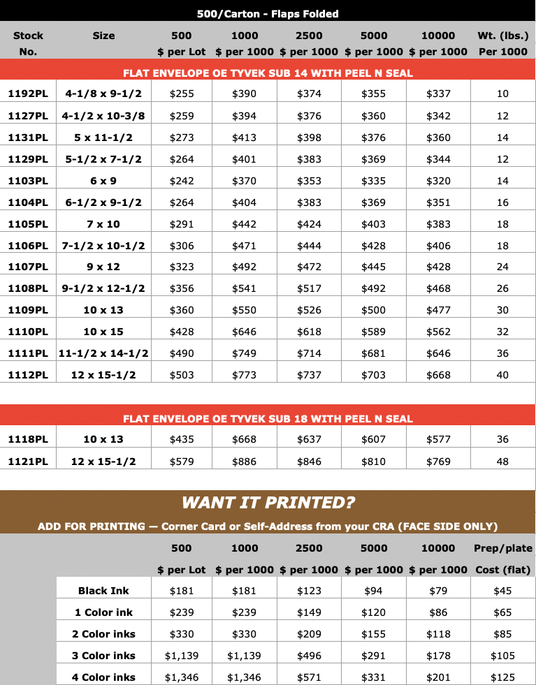 Flat, plain Tyvek® mailers are great no-nonsense envelopes for mailing practically anything that you can fit in a flat envelope, where strength and light weight (to reduce postage costs) are a factor. You can avoid printing your return address by using labels that you already have. We highly recommend sub 11 (when available) as anything heavier is usually overkill.